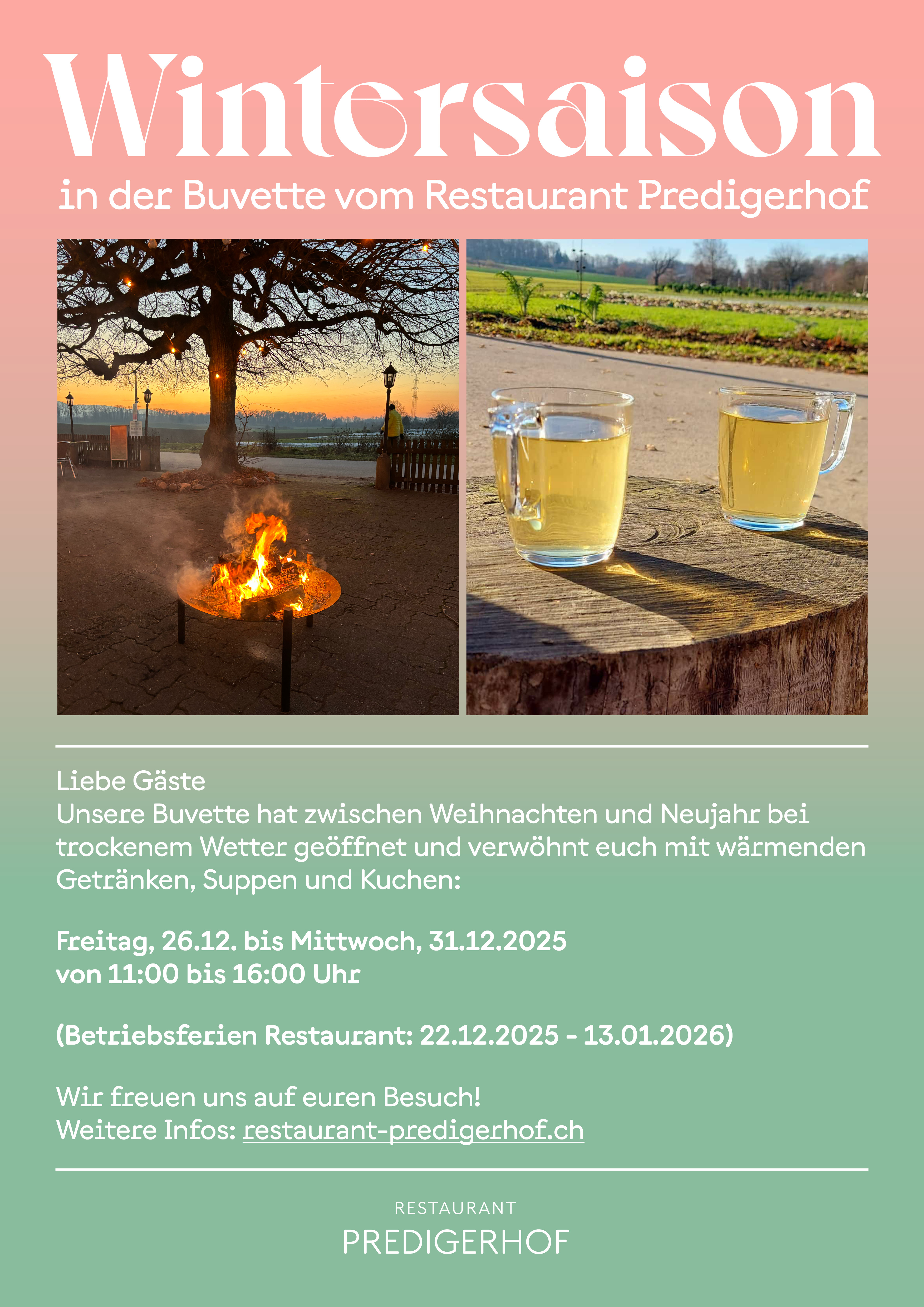 Auch im täglichen Betrieb zeigt sich eine erfreuliche Entwicklung. Der Predigerhof bleibt ein fester Treffpunkt für viele Menschen aus der Region. Ab Mitte Januar erweitert das Restaurant sein Angebot mit einem wöchentlichen Suppentreff, jeweils am Freitagmittag.