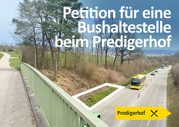 Das hintere Bruderholz rund um den Predigerhof soll mit dem öffentlichen Verkehr erschlossen werden. Auf der Bruderholz-Strasse beim Brücklein zwischen Bottmingen und Münchenstein könnte im Rahmen der geplanten Verbreiterung der Strasse eine Bushaltestelle eingerichtet werden. Dies würde ermöglichen, den motorisierten Individualverkehr auf dem hinteren Bruderholz zu reduzieren und die Gegend auch für mobilitätseingeschränkte Personen zu erschliessen.
