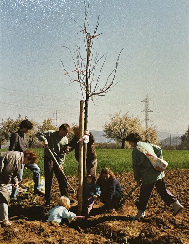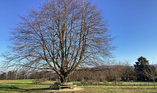 Im Obstgarten ist Winterruhe eingekehrt. Die Bäume haben ihre Blätter verloren, nur Vereinzelte trotzen noch dem Wind. Dafür sieht man jetzt, wie prächtig die Linde gewachsen ist, die jetzt etwa 40 Jahre alt ist. Gepflanzt wurde der etwa 4 Jahre alte Baum im Frühjahr 1989 für Sonja, unsere jüngere Tochter, die damals etwas mehr als 1 Jahr alt war. Seit die Rundbank um den Stamm der Linde errichtet wurde, bietet der Baum Schatten für jene, die darauf Platz nehmen, um sich auszuruhen oder einen Moment lang, die Stimmung auf dem Bruderholz zu geniessen.